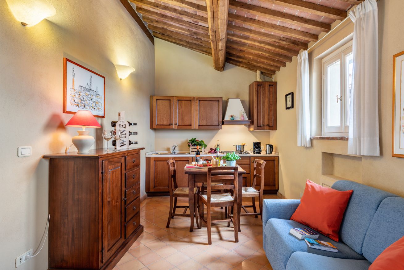 Un bilocale intimo e raffinato di 40 mq ideale per una coppia; è situato al secondo piano della VIlla ed è composto da un soggiorno con angolo cottura, una camera matrimoniale e un bagno con doccia. Ogni stanza è incorniciata da splendidi soffitti spioventi con travi di legno a vista e dalla camera da letto si può ammirare l’incantevole paesaggio delle colline senesi.
