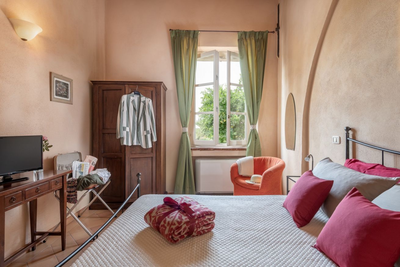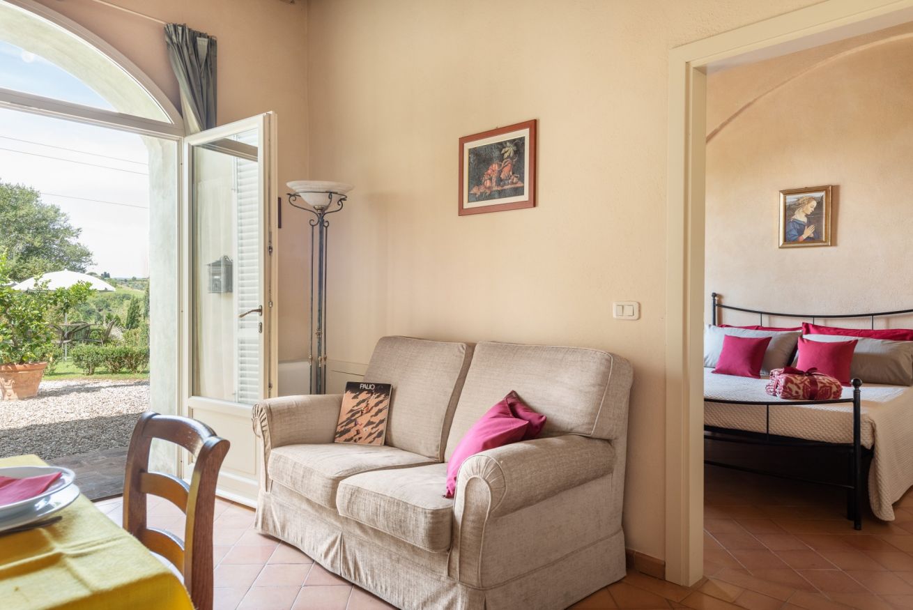 L’appartamento può ospitare 2 persone, si trova al pian terreno della Villa e proprio grazie a questa sua posizione garantisce un accesso immediato ai nostri giardini, attrezzati con tavoli, sedie e ombrelloni.