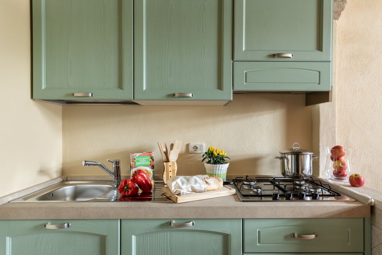 Oltrepassando una caratteristica porta arcuata si entra nell’ambiente giorno, dove si trova una cucina a vista attrezzata con lavastoviglie, frigorifero e tutti i piccoli elettrodomestici di cui si ha costantemente bisogno e un comodo divano dove poter guardare la tv o semplicemente rilassarsi con un bel libro a fine giornata.