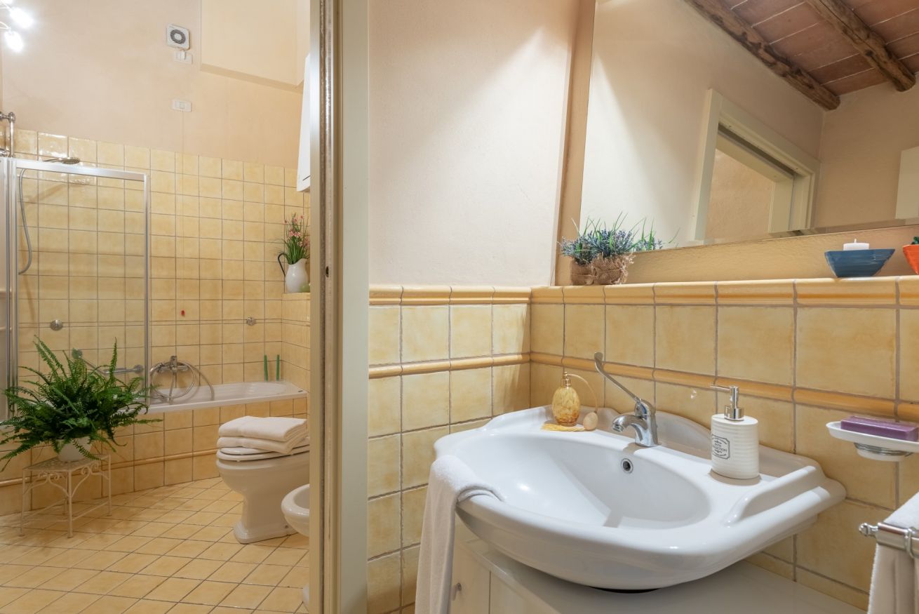 L’appartamento è incorniciato da splendidi soffitti con travi di legno, tipici toscani.
