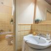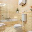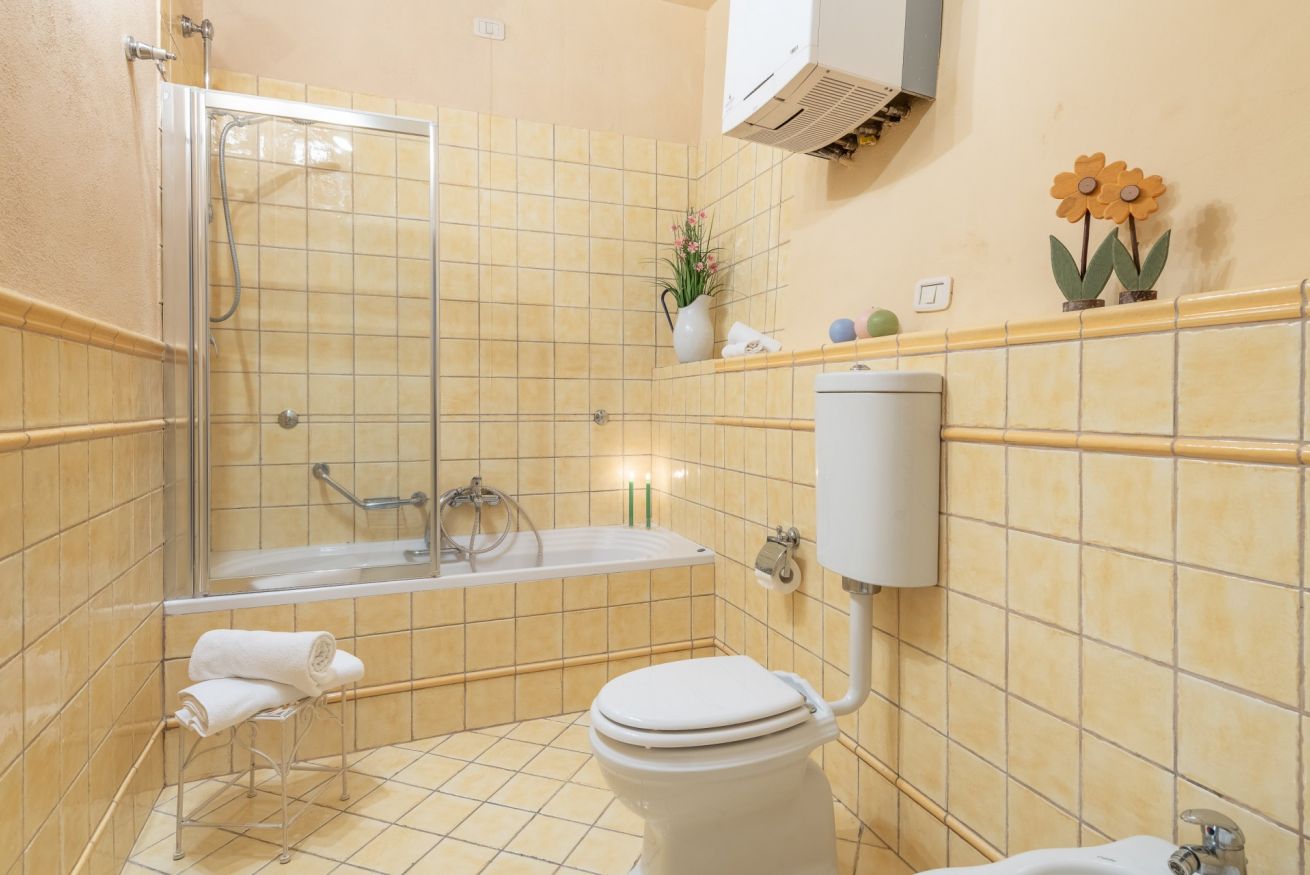 Proseguendo sulla sinistra si trova un’ampia camera matrimoniale e un caratteristico bagno con vasca/ doccia.